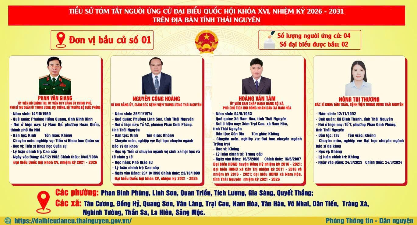 Trang Thông tin điện tử phường Quan Triều trân trọng giới thiệu infographic tiểu sử tóm tắt 20 người ứng cử đại biểu Quốc hội khóa XVI trên địa bàn tỉnh Thái Nguyên nhiệm kỳ 2026 - 2031 tại 05 đơn vị bầu cử trên địa bàn tỉnh.